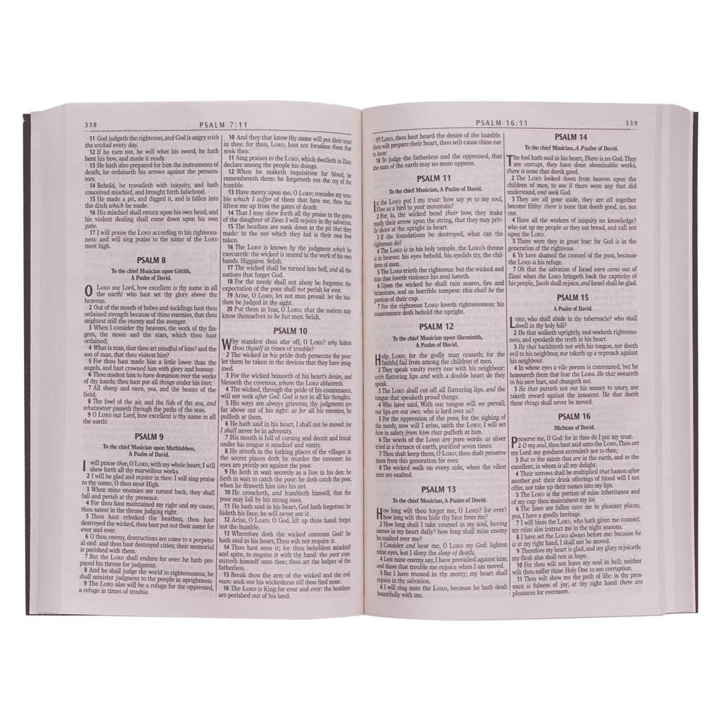 Inside, you'll find the classic 1769 edition of the King James Version in an easy-to-read 8-point font. This version has been a favorite for centuries and is still praised for its accuracy.