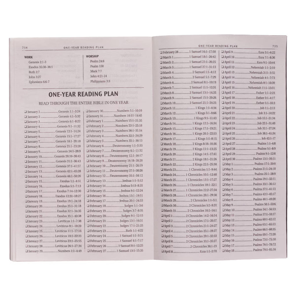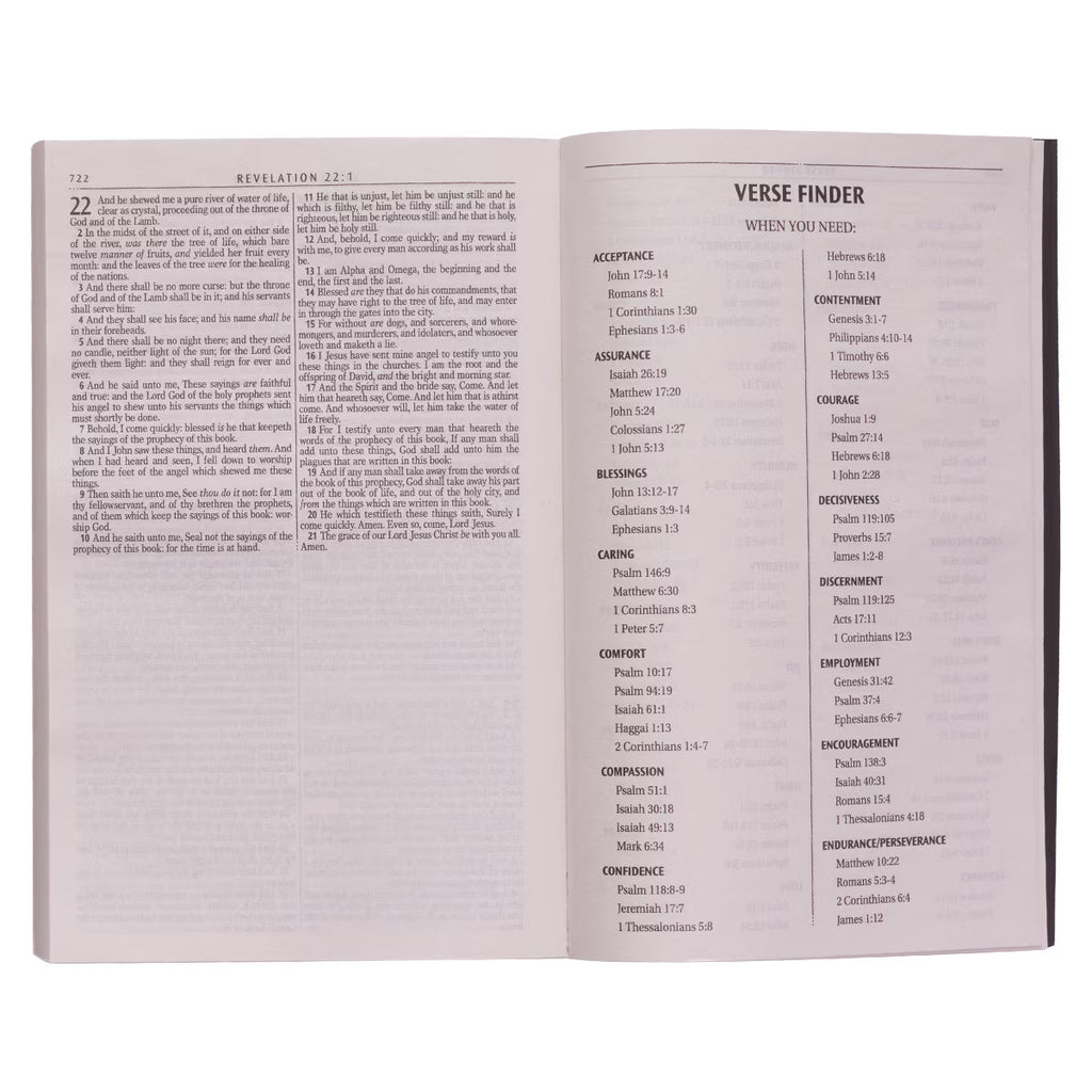 This standard print volume (8-point type) features an accommodating lay-flat binding, a double-column format, a helpful thematic Scripture verse finder, and a one-year Bible reading plan. A presentation page is included to write a meaningful message to the recipient.