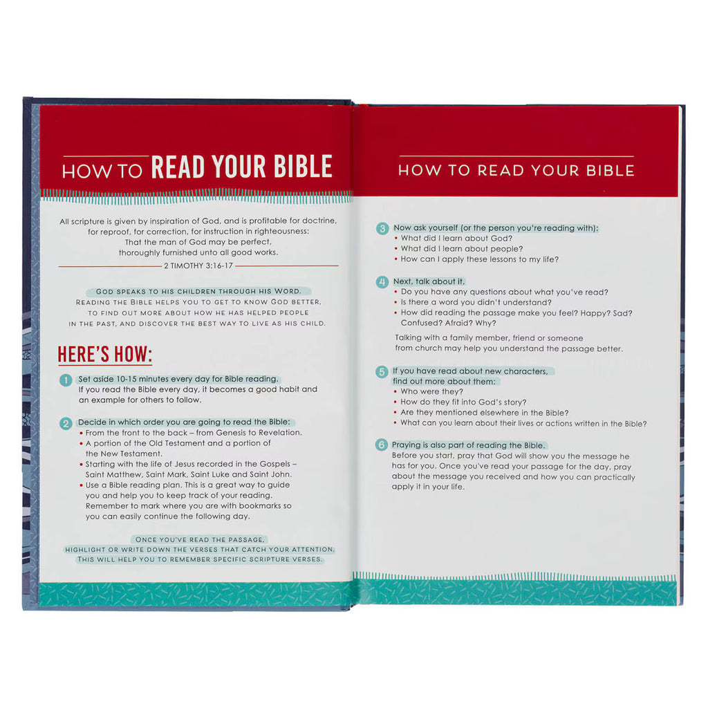 Invest in your son or grandson's spiritual formation with the Blue Hardcover Kid's King James Version Bible—a remarkable and meaningful birthday or Christmas gift choice. Purposefully designed to captivate children's hearts and minds with the stories of the Bible, this captivating edition will become a beloved and cherished first Bible.