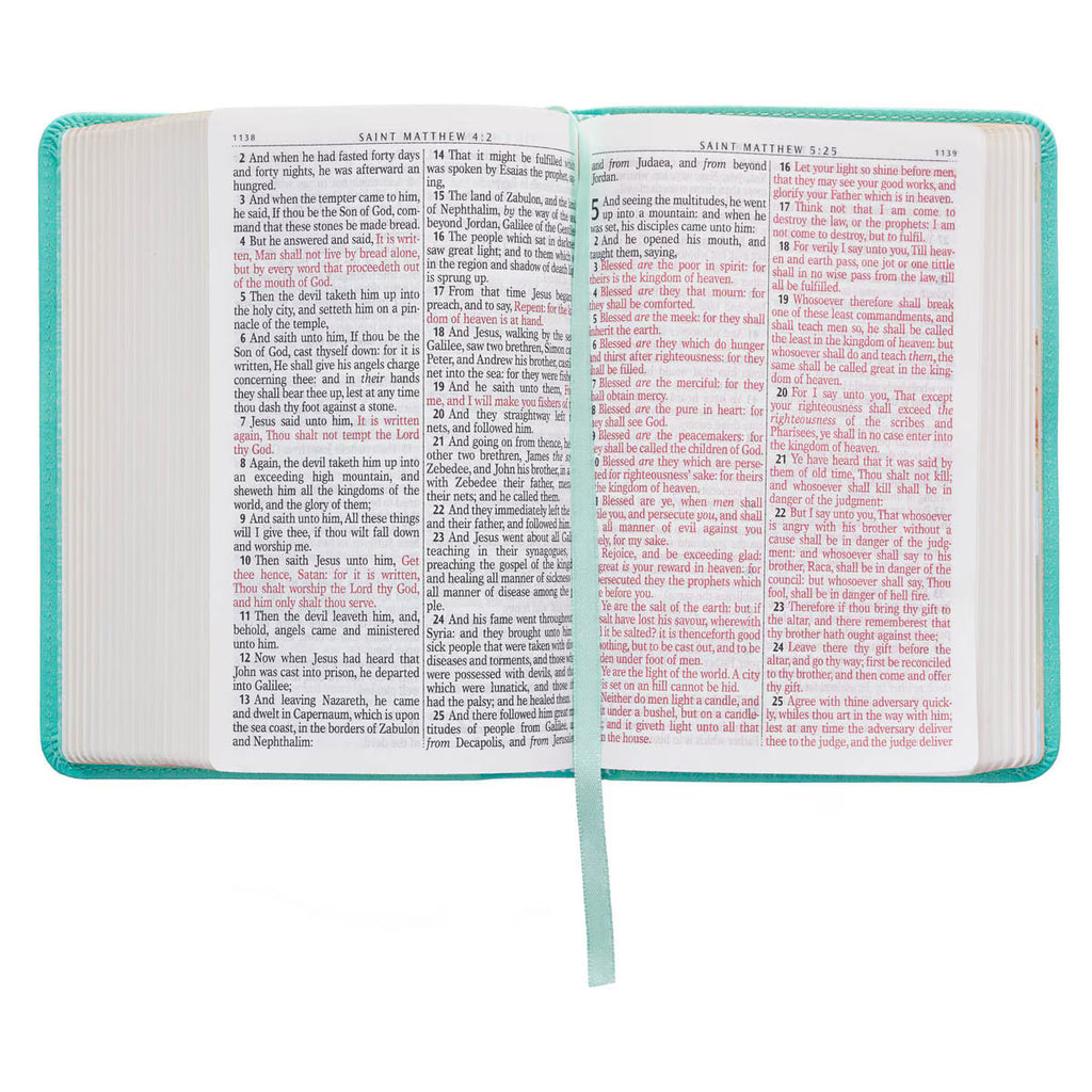 The elegant Robin's-egg Blue Faux Leather Large Print Compact King James Version Bible is neither too small nor too big, and the large print is just the perfect size for easy reading in a small Bible! This compact Bible is markedly smaller than a standard Bible, with 10-point text that is slightly larger than the standard 8-point type found in most pew Bibles. 10-point type is considered a large print for a small or compact Bible.