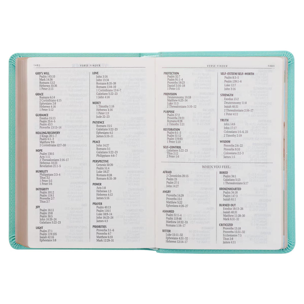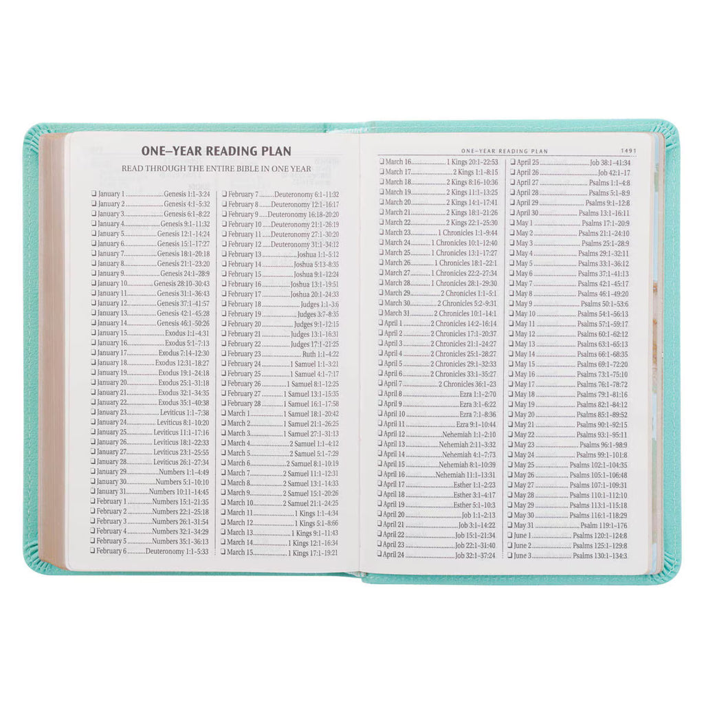 Consider giving this exquisitely designed and meticulously finished Robin's-egg Blue Faux Leather Large Print Compact King James Version Bible to a special niece or granddaughter as a token of your affection and care.