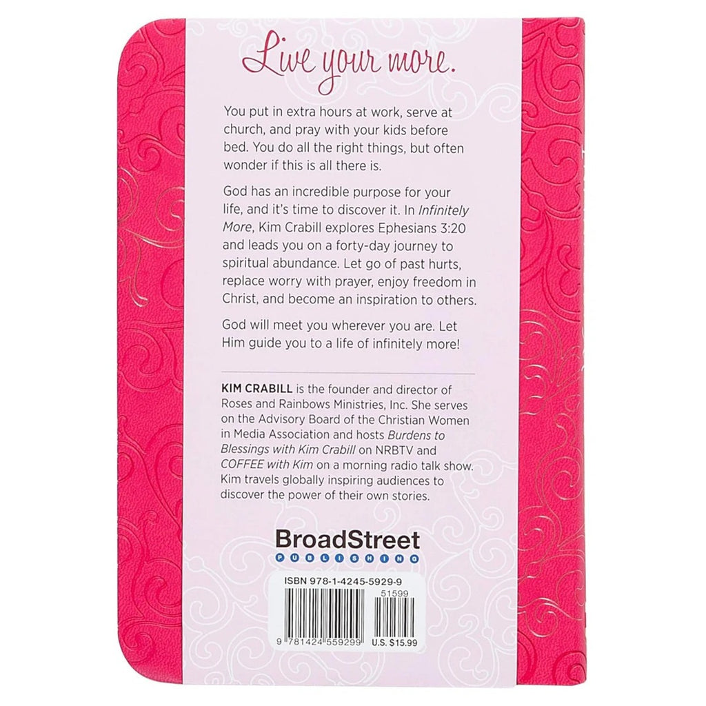 God has an incredible purpose for your life, and it s time to discover it. In Infinitely More, Kim Crabill explores Ephesians 3:20 and leads you on a forty-day devotional journey to spiritual abundance. Let go of past hurts, replace worry with prayer, enjoy freedom in Christ, and become an inspiration to others.