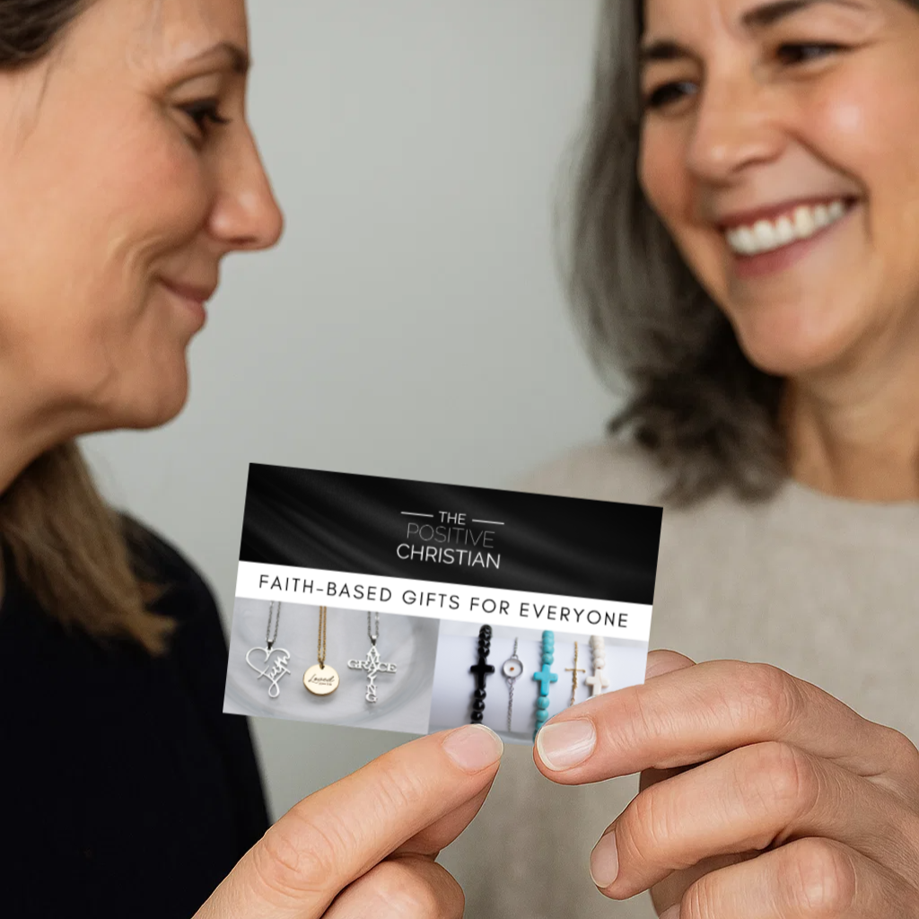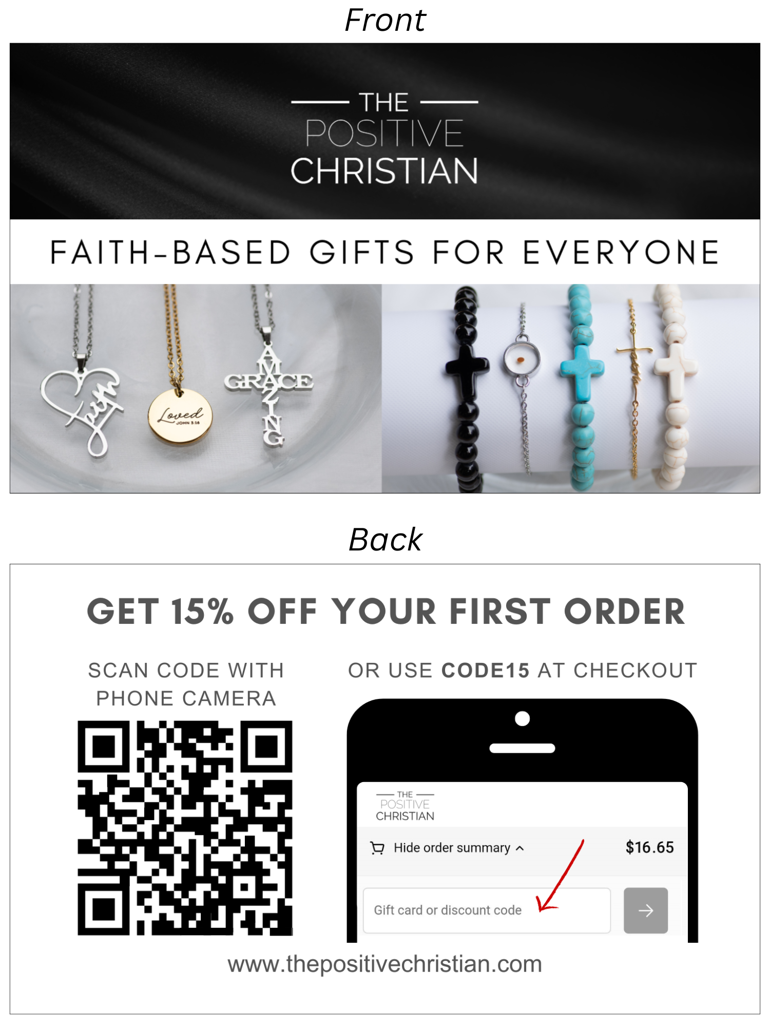 They are business card sized and have a glossy-finish and not only look professional, but also provide your customers with a 15% discount on our faith-based items!