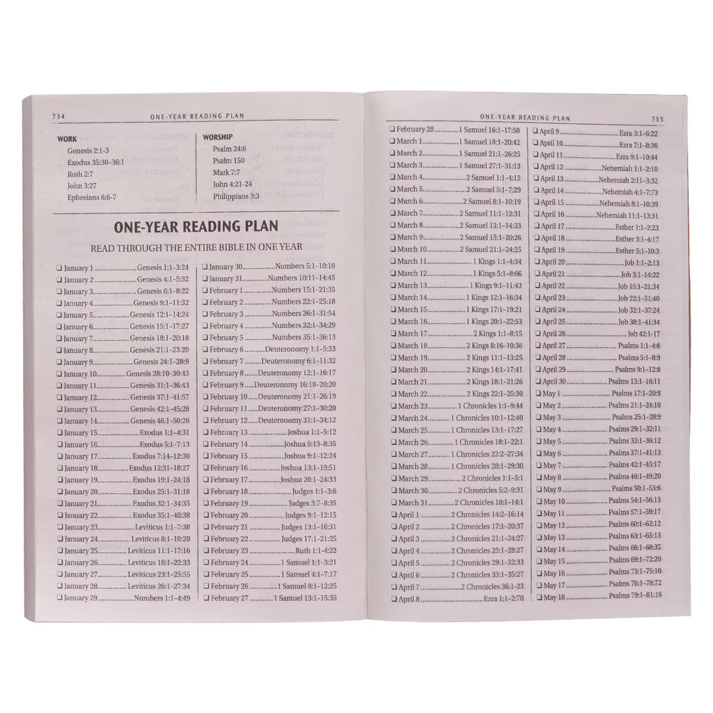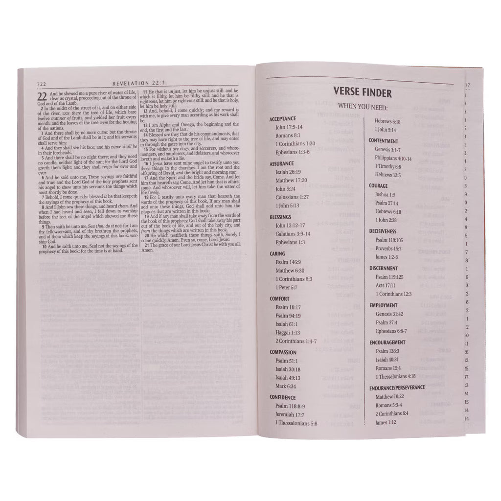 The flexible cover of the paperback binding fits perfectly in your hand, and the lay-flat spine binding allows the Bible to open without damage to the spine. This Bible features an economical but also very modern flush-cut look. Additional features include a double-column format, a helpful Scripture verse finder by topic, and a one-year Bible reading plan. The text is printed in a standard 8-point type that is standard for most Bibles. The Bible is individually packaged in a full-color printed cardboard sleeve and shrink-wrapped.