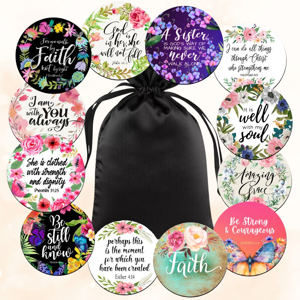 Inspire faith and encouragement every day with The Ultimate Circle Magnet Bundle. This is a thoughtfully curated set of 12 inspirational circle magnets, beautifully packaged in a black satin drawstring bag for easy gifting or storage.